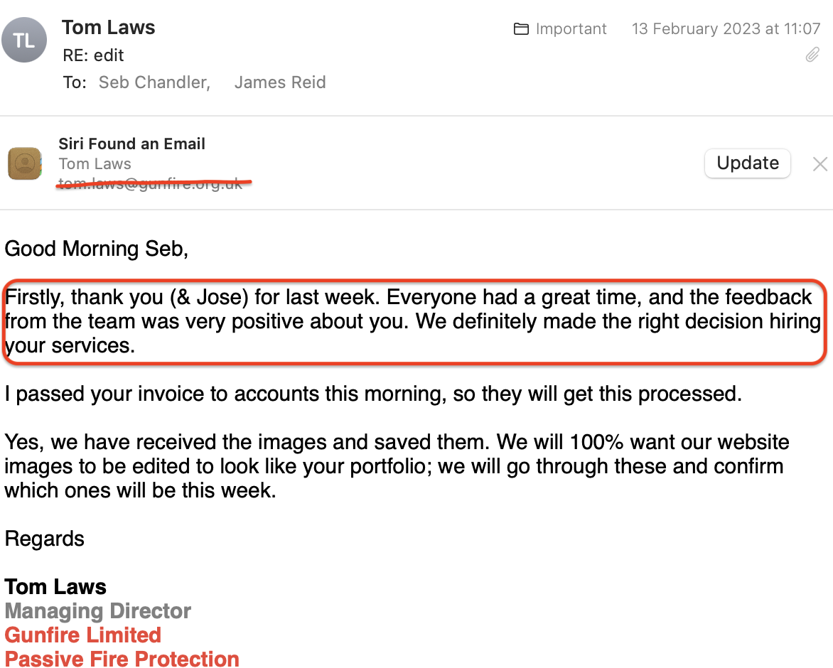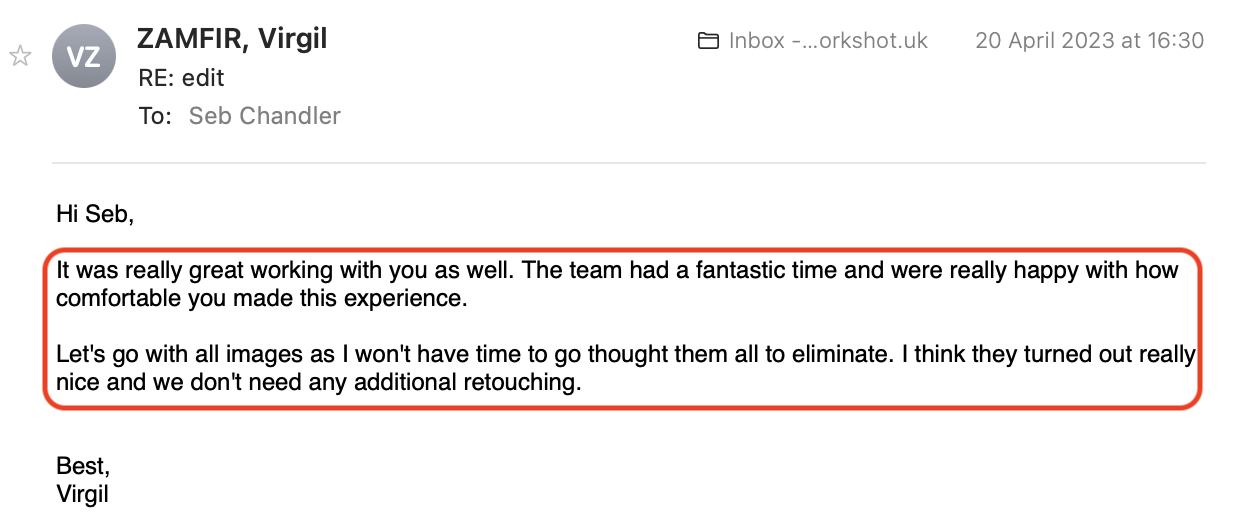 I found Seb great to work with and we ended up with images that really reflected the ethos of my business and the work we do. I was so happy with what he supplied. I could not recommend his services enough