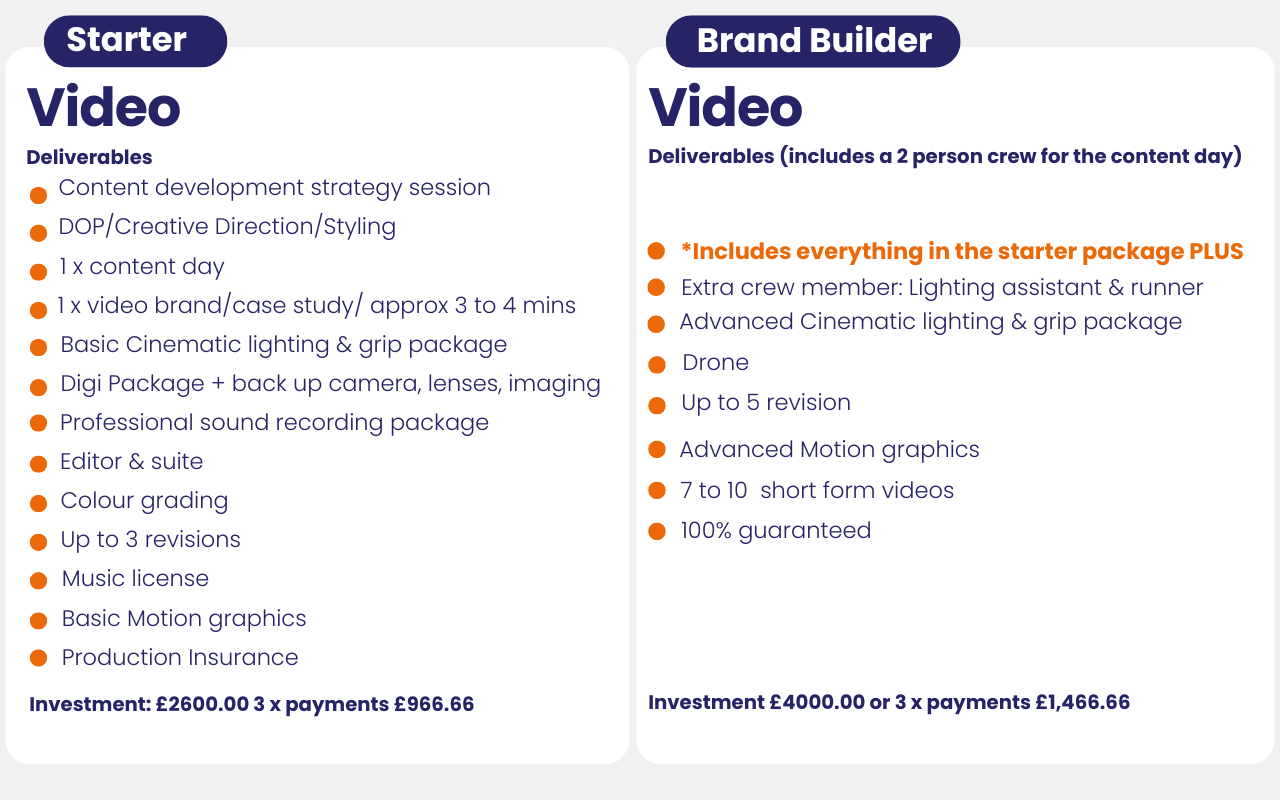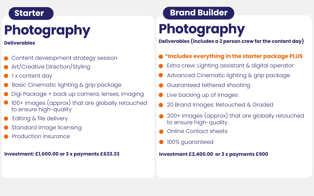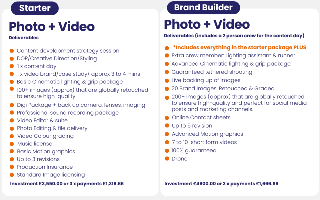*PLEASE NOTE: These are “off the shelf” packages, designed to serve as a guide. We can tailor our services to your business needs and budgets. Investments shown are ex VAT.