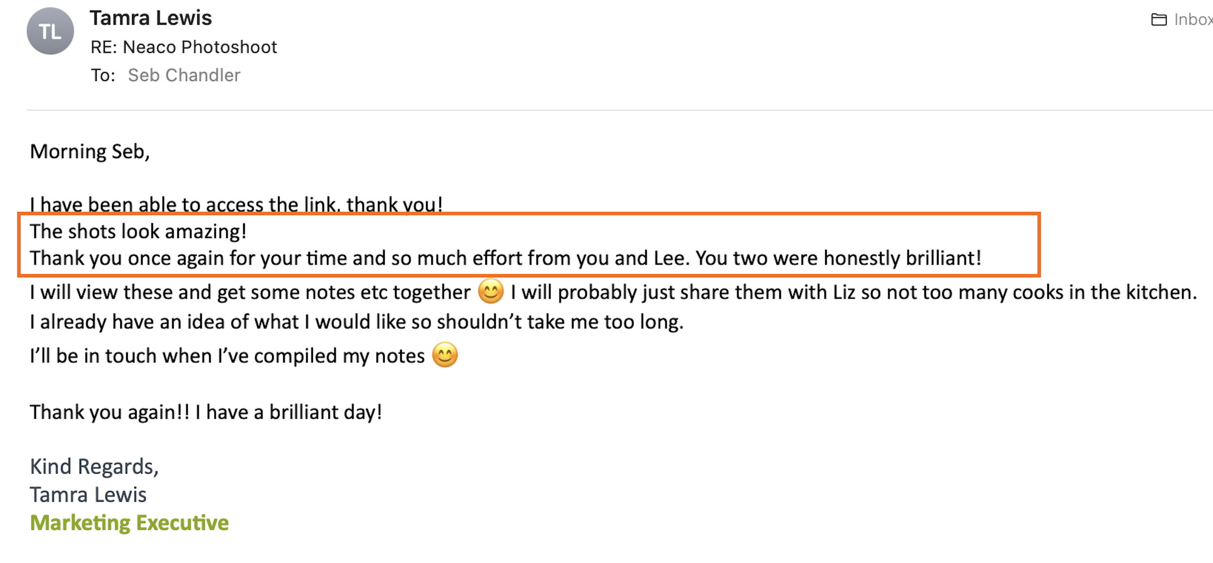Initial discourse with Seb was very detailed, including getting a brief with mood boards and seeing examples of his previous work. On-site he was very professional and sympathetic to our busy factory environment, directing the day with me in an efficient manner. He had a great rapport with all my staff and made some of them feel a lot better, who were uncomfortable being in front of the camera.